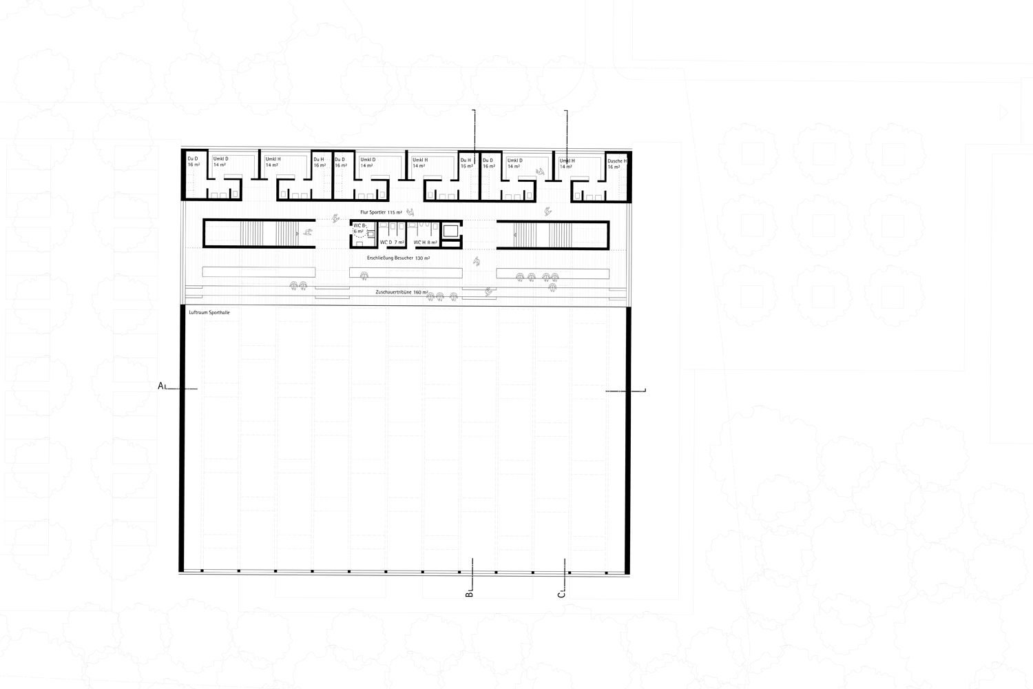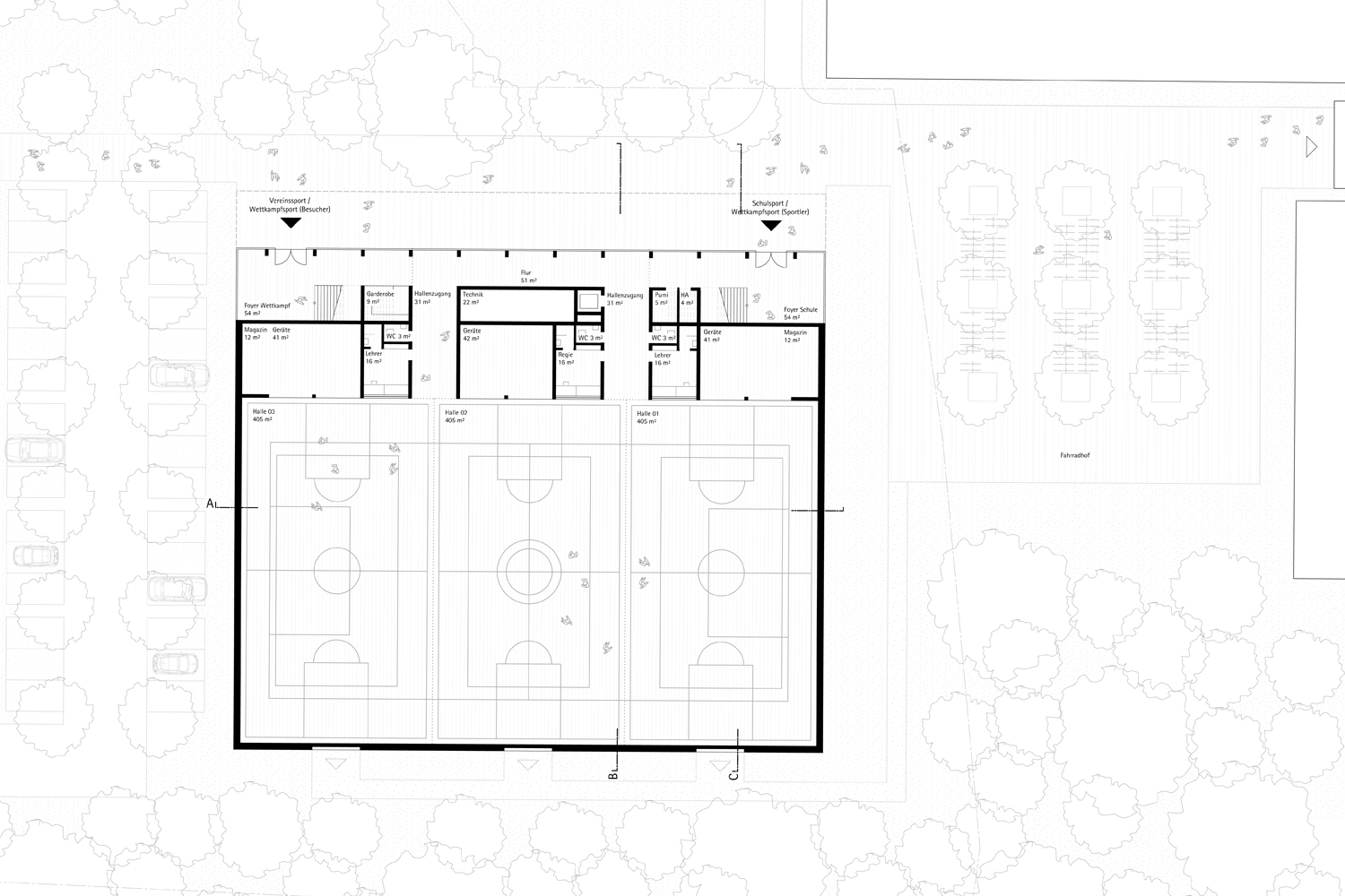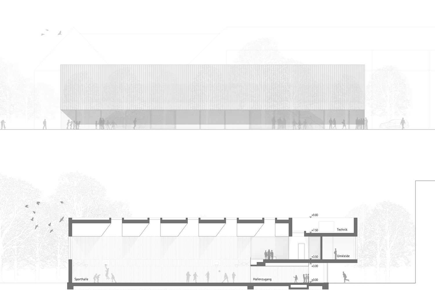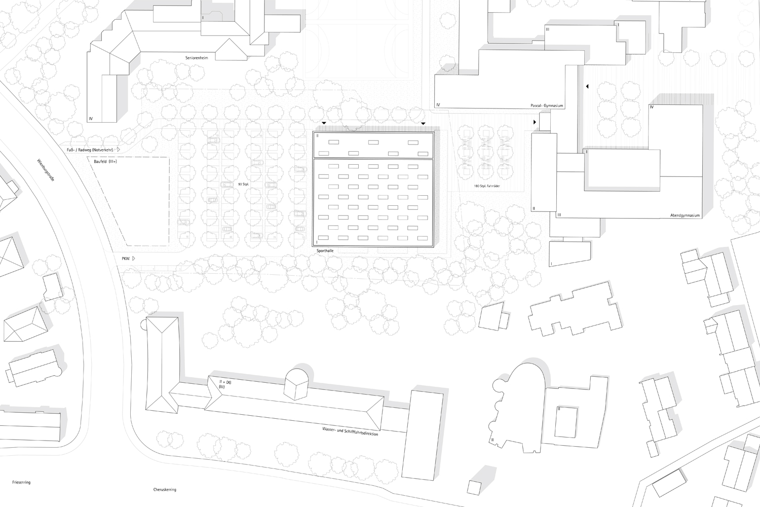 Die für Schul-/Vereinssport bzw. Sportler/Besucher getrennten Zugänge im Norden liegen durch eine Gebäudeauskragung geschützt am neuen Fuß- und Radweg, der weiterführend auch die bestehenden Gebäudeteile erschliesst.