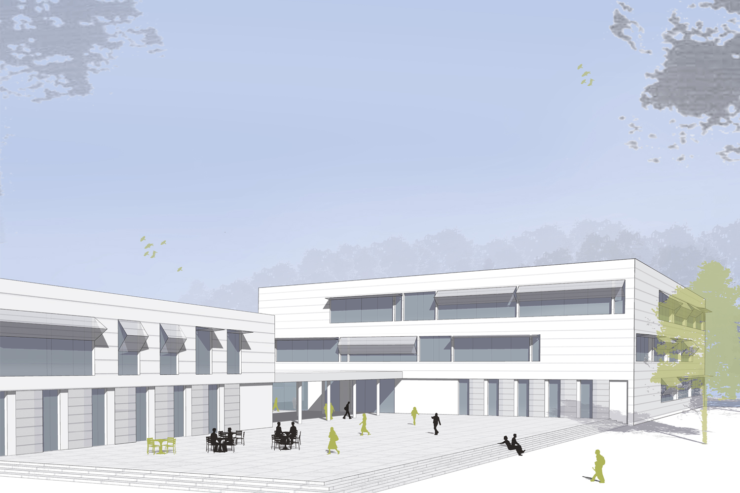 Die Erweiterungsbauten des Schulzentrums Overath – Cyriax schließen sich südlich an die vorhandene Gebäudestruktur an. Ein gemeinsamer durchgehender Schulpark schafft den räumlichen Übergang zur Aggerlandschaft.