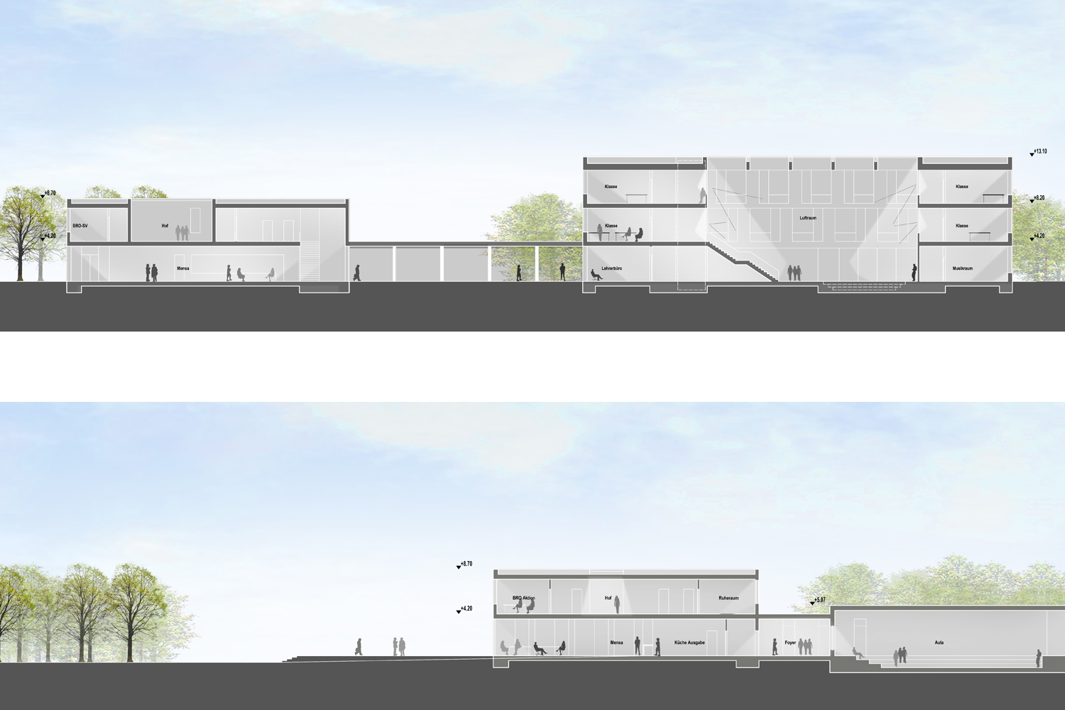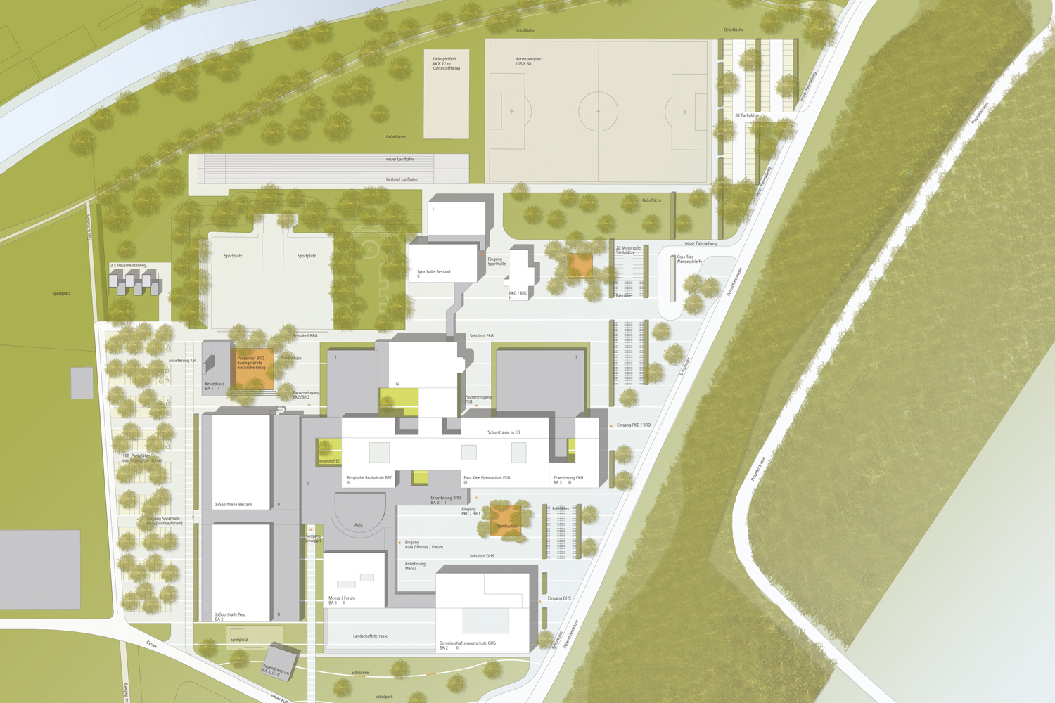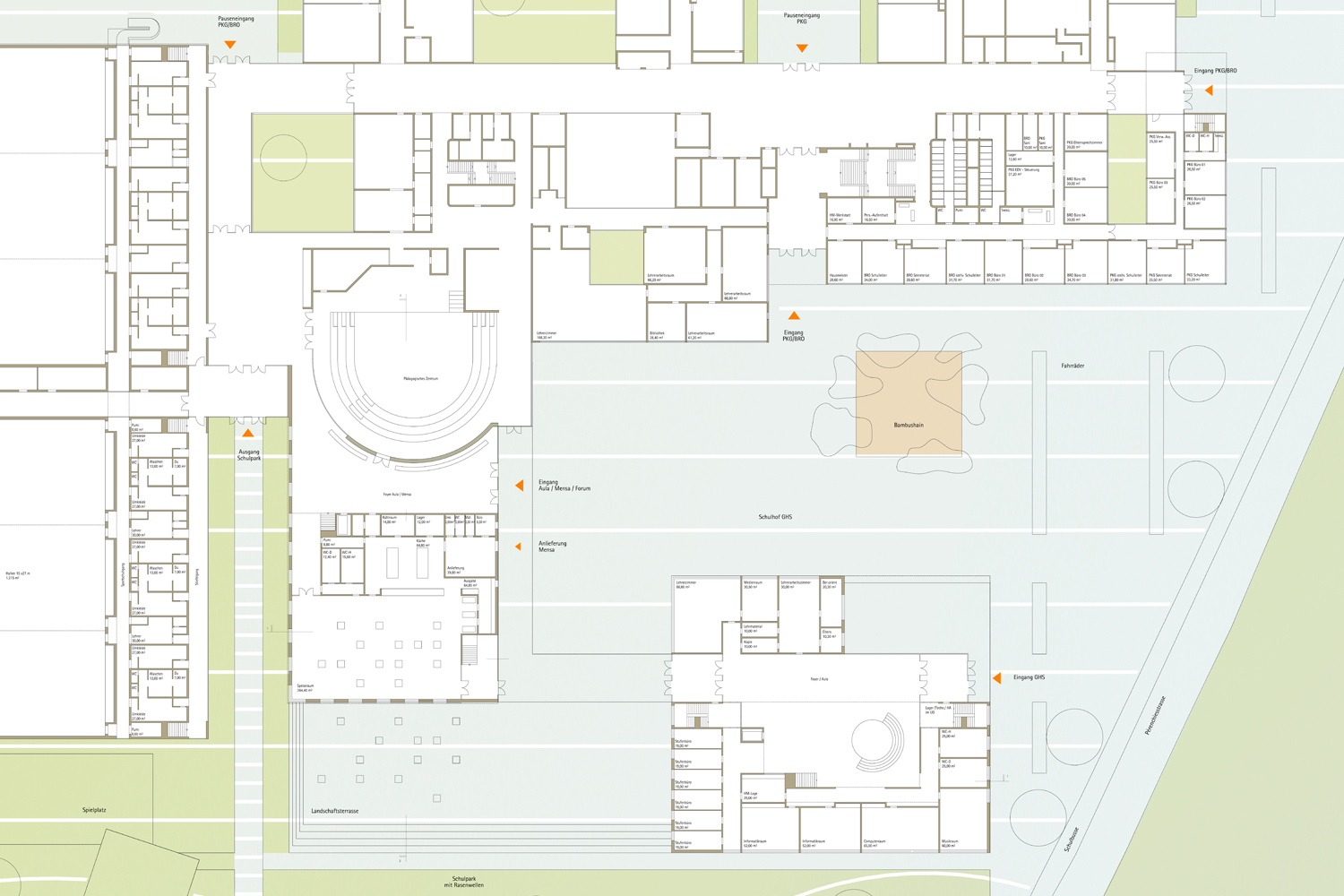 Hier an ihren Haupteingängen beginnen die beiden Schulstrassen, die sich intern konsequent fortgeführt in einer großen U-Form vereinigen. Gemeinschaftliche Einrichtungen wie Mensa, Forum, Aula und die Sportbereiche verbinden als Querspange die beiden Schulstraßen miteinander.