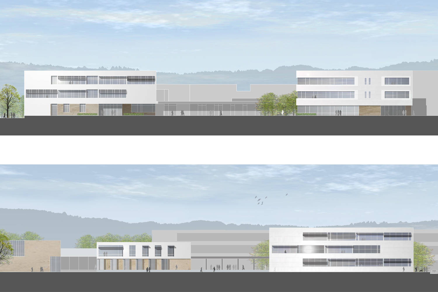 Sowohl die neue Gemeinschaftshauptschule als auch der Erweiterungsbau des PKG erhalten Kopfbauten zur Pérenchiestraße und dienen so auf prägnante Weise der jeweils eigenen Adressbildung und Ablesbarkeit beider Schulen.
