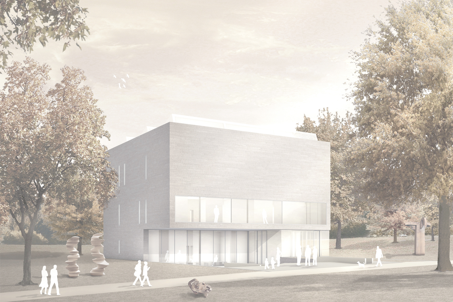 Als skulpturaler Solitär steht der öffentliche Ausstellungsbereich frei zwischen Feldtor und Abtei eingebettet in der Parklandschaft.