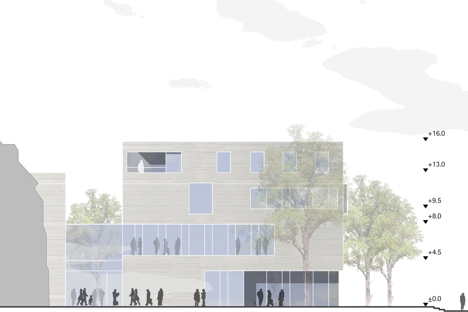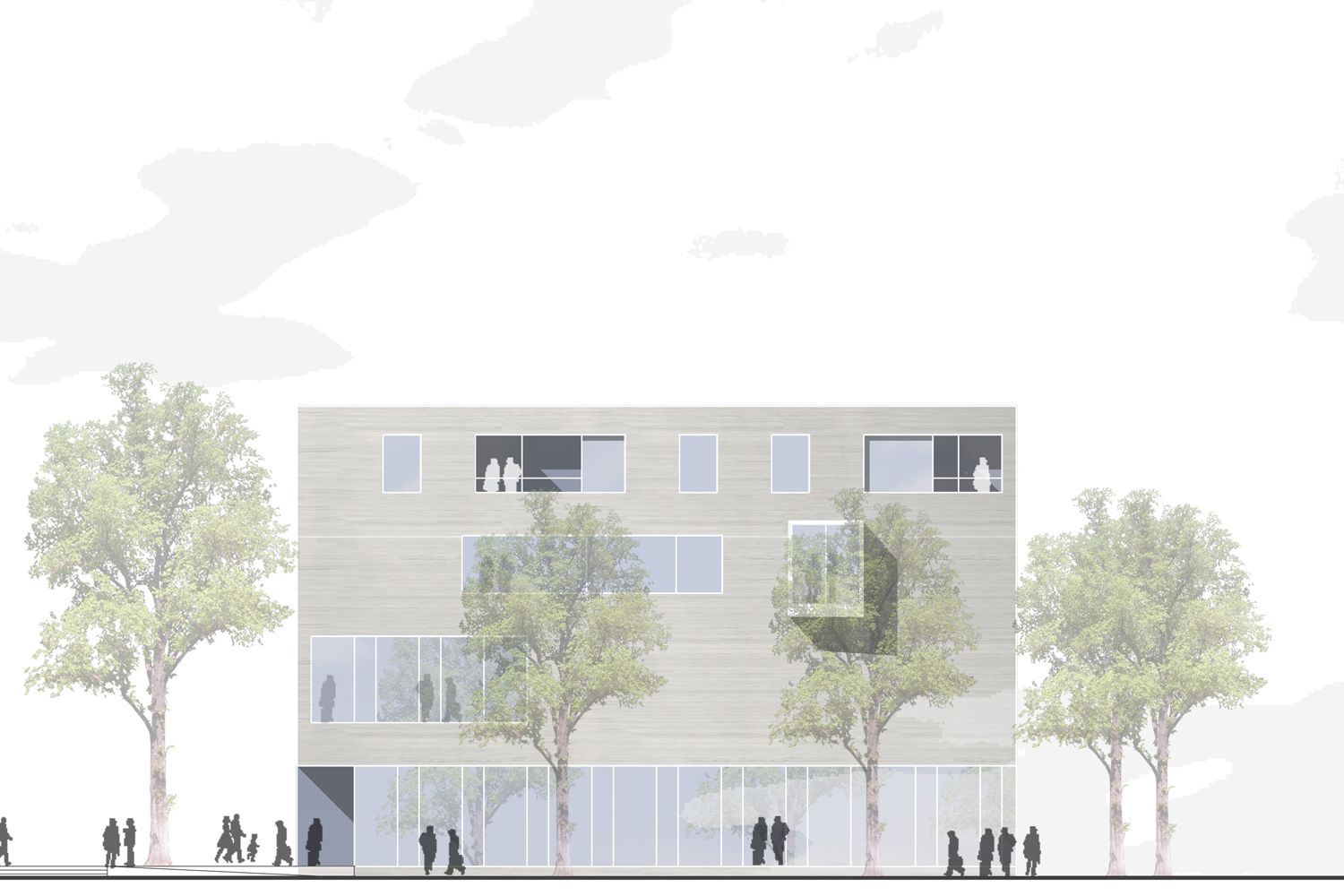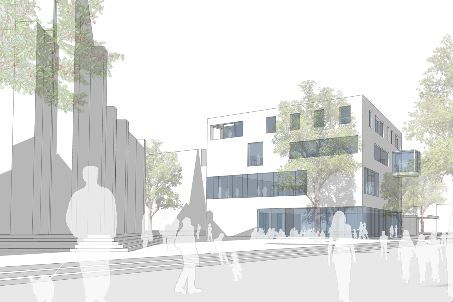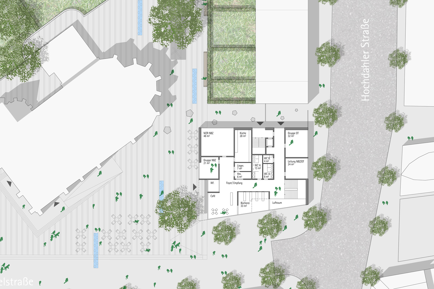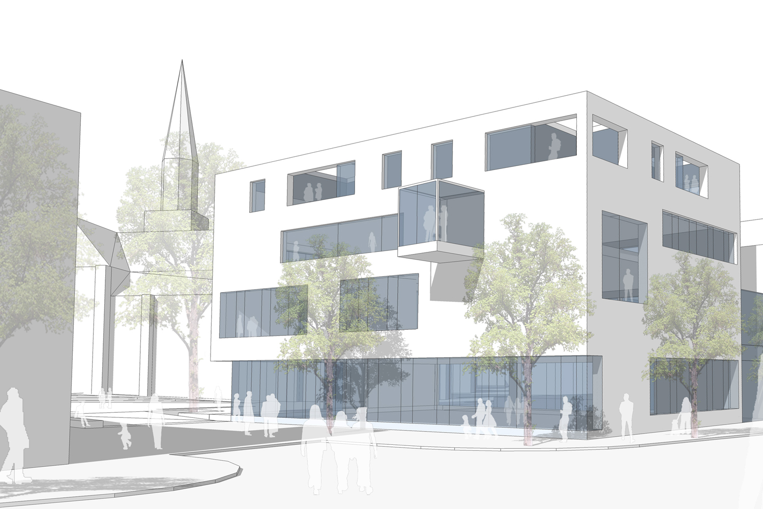 Die Wohnbebauung zeigt sich unprätentiös in zwei L-förmigen Winkelbaukörpern, die linear den Straßenraum besetzen. Den Duktus des freistehenden villenartigen Pfarrhauses nehmen weitere kleinere Baukörper auf. Die an dieser Stelle offene Bauweise gewährt interessante Durchblicke auf die St.Jakobus Kirche, die so von mehreren Seiten in den Blickpunkt gerückt wird. Alle Baukörper werden kontextuell zu Bausteinen eines zusammenhängend erlebbaren und durchlässigen Stadtraumes, der sich über die Hochdahler Straße hinaus bis zum Vorplatz des Busbahnhofes erstreckt.