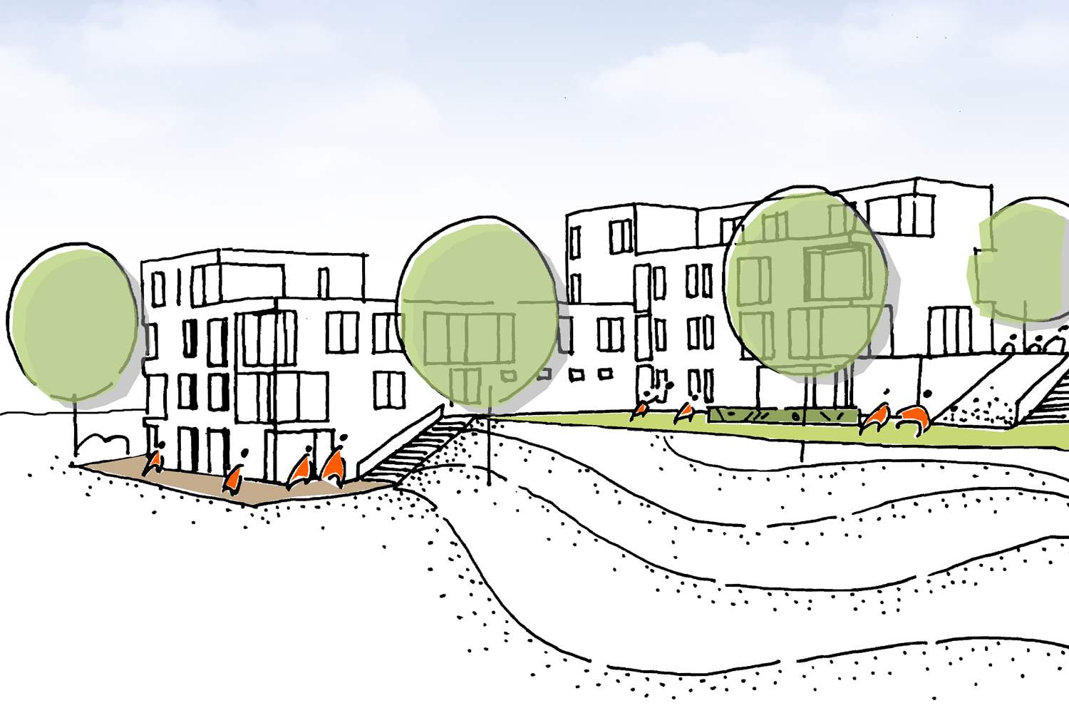 Die weiche Topografie ist Ausgangspunkt für eine Verknüpfung der Gebäudestrukturen entlang der Hangkante und deren Integration in die Landschaft.