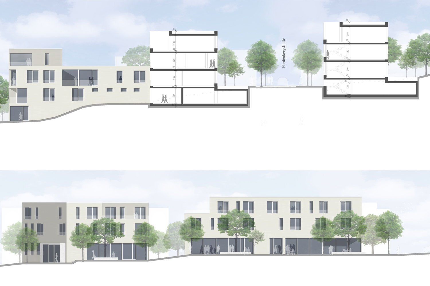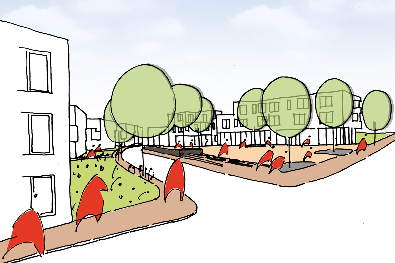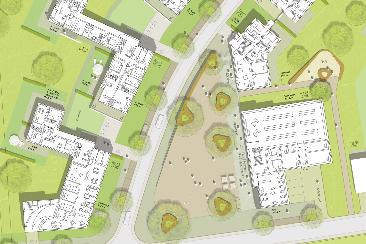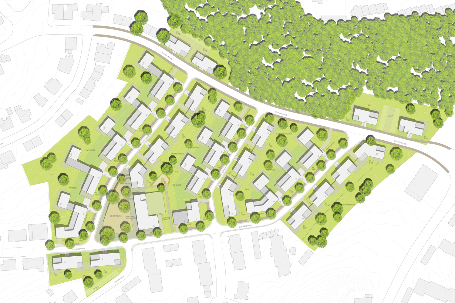 Das Siedlungsgebiet "Am Müggenberg" aus den frühen 50er Jahren strahlt durch seine mit einfachen verständlichen Häusern lose bebaute und stark durchgrünte städtebauliche Struktur einen spezifisch freundlich-schlichten Charme aus, dessen Besonderheit in die neue - wenn auch dichtere- Quartiersbebauung transformiert werden soll. Deshalb basiert das neue städtebauliche Grundgerüst auf einer linear offenen Anordnung von nicht übermäßig großen Einzelbaukörpern, die sich wie ehedem in weich verlaufenden Bögen an die Straßenkonturen anlehnen.